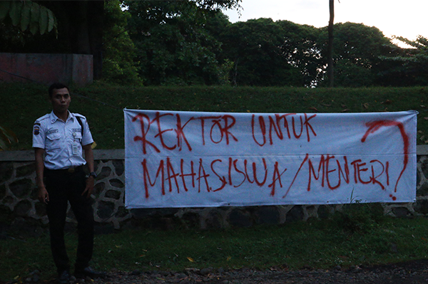 Petugas Satuan Pengamanan (satpam) Kampus III, M. Safuan menjelaskan bahwa belum diketahui pasti, siapa dalang di balik pemasangan baliho-baliho bertuliskan “Rektor untuk mahasiswa/menteri?”, “kapan debat pemilihan rektor” serta “Pemilihan rektor, mahasiswa bisa apa” tersebut.