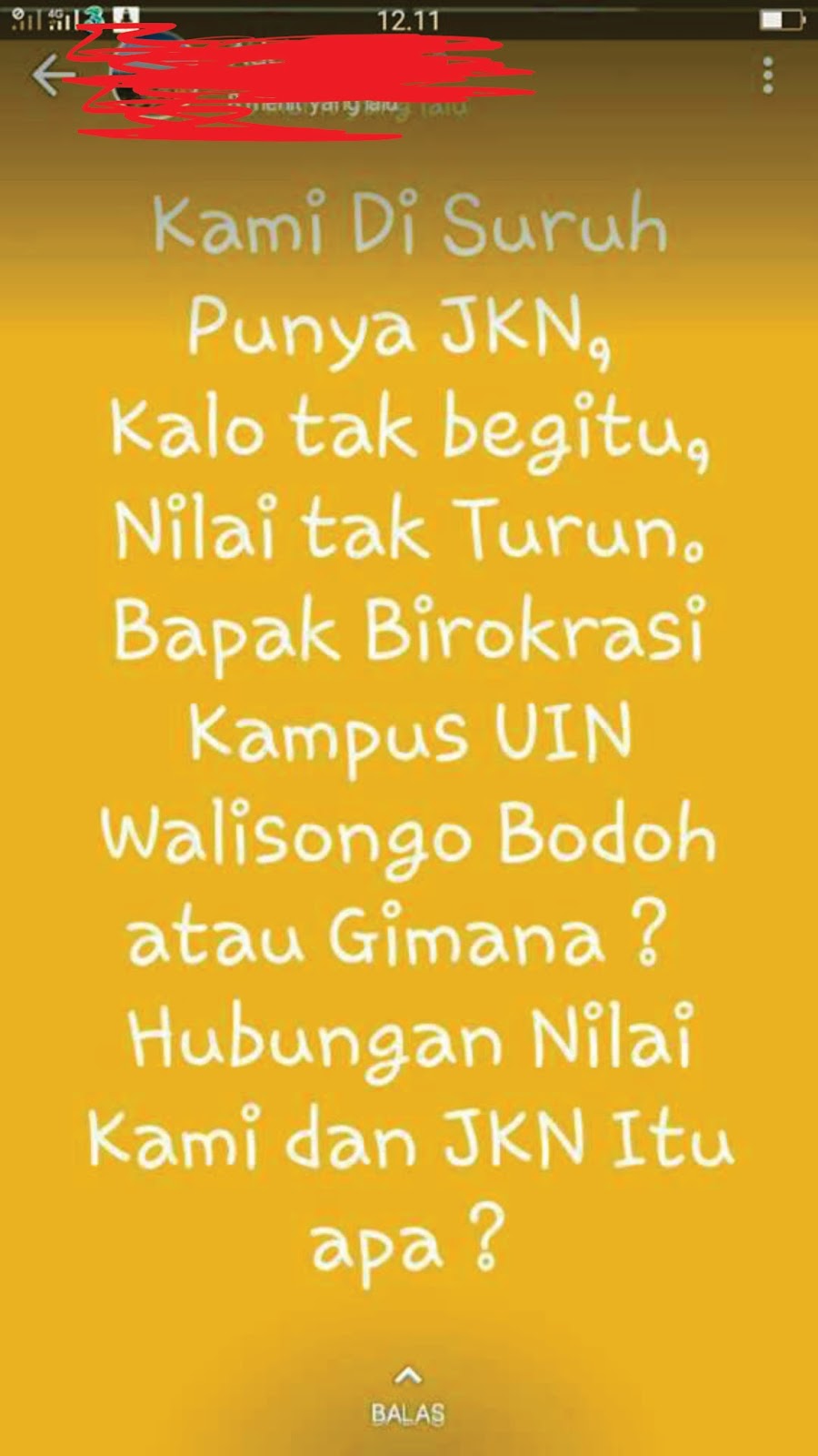 Beberapa mahasiswa melalui akun Whatsapp mengatakan bahwa JKN sama sekali tidak ada hubungannya dengan nilai. Bahkan, ada yang berkomentar cukup sarkastik. Simak cuplikan screenshot Whatsapp story berikut.