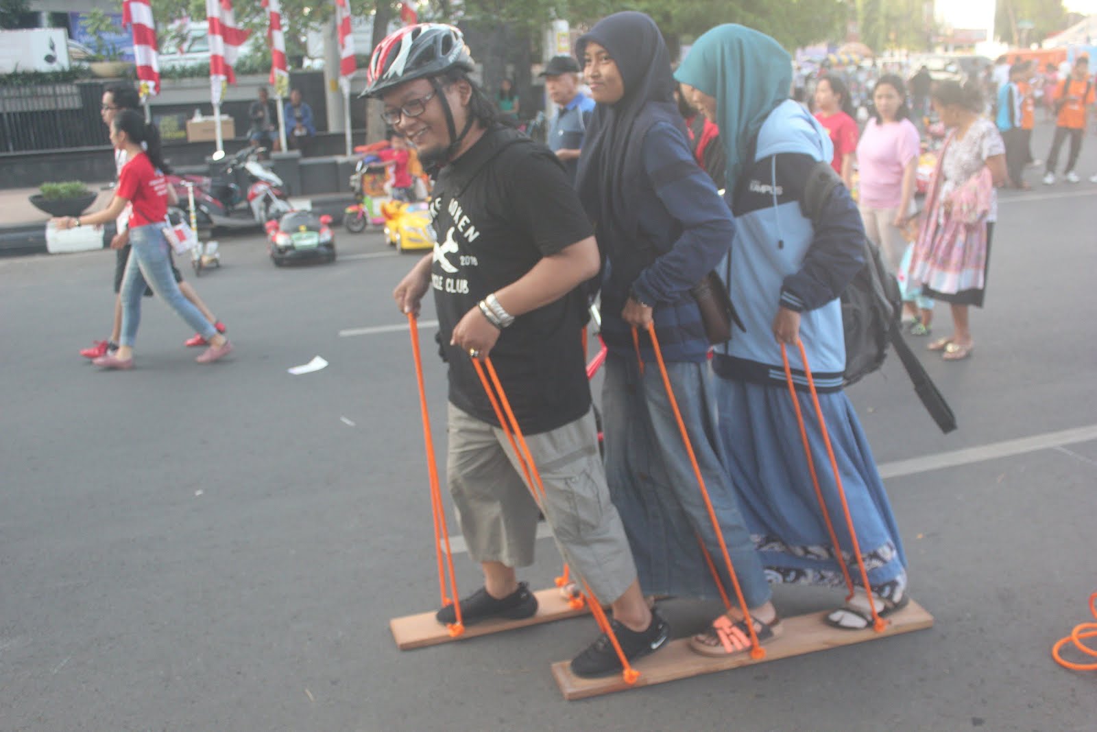 SEMARANG – lpmmissi.com. Tezar (15) sesekali tertawa melihat temannya sedang bermain Egrang di Car Free Day(CFD) Jl Pahlawan, Minggu (21/8). Akan tetapi, dia merasa malu untuk ikut serta bermain. Siswa kelas IX itu mengaku belum terbiasa, sebab di lingkungan tempat tinggalnya di Layur, permainan tradisional sudah sulit ditemukan.
