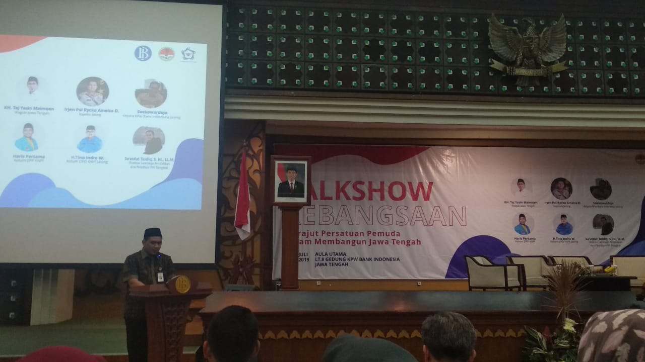 Hal tersebut ia sampaikan ketika memberi sambutan dalam acara Talkshow Kebangsaan bertajuk “Merajut Persatuan Pemuda dalam Membangun Jawa Tengah” yang diselenggarakan Generasi Baru Indonesia (Genbi) bekerjasama dengan Garda NKRI Jateng di Aula Utama Lt.8 Gedung Kantor Perwakilan (KPw) Bank Indonesia (BI) Jateng, Selasa (30/7).