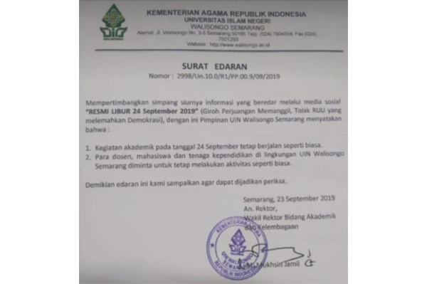 Melalui surat edaran yang bernomor 2998/ Un.10.0/R1/PP.00.9/09/2019. Mukhsin menyampaikan dua hal. Pertama, mengkonfirmasi bahwa informasi yang menyatakan tanggal 24 September libur adalah tidak benar.